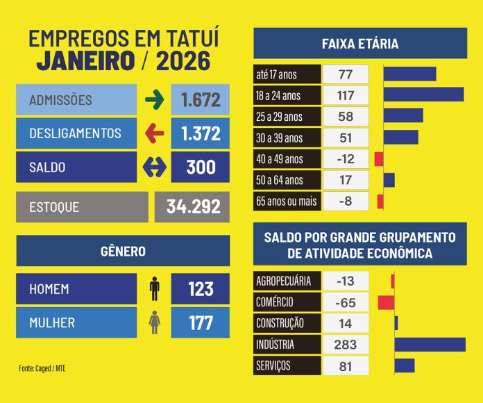 O número de vagas de emprego em Tatuí fechou janeiro com saldo positivo. Ao longo do mês, foram abertas 300 novas vagas, com 1.672 admissões e 1.372 desligamentos, de acordo com dados do Caged (Cadastro Geral de Empregados e Desempregados). Já o mês anterior, dezembro de 2025, teve saldo negativo, com o município tendo perdido 518 cargos (854 contratados e 1.372 demitidos).