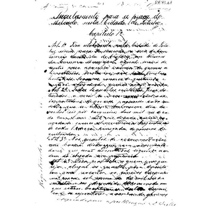 Manuscrito raro de 1880 mostra o regulamento da primeira praça de mercado de Tatuí. Documento detalha desde o tempo em que os comerciantes poderiam vender animais até a fiscalização rigorosa de produtos estragados no espaço, previstos em 28 normas originais regulando o comércio de gêneros alimentícios na antiga Rua do Commercio, esquina com a Rua do Chafariz (Foto: Acervo Histórico da Assembleia Legislativa do Estado de São Paulo (Alesp). Documento RE80.068)