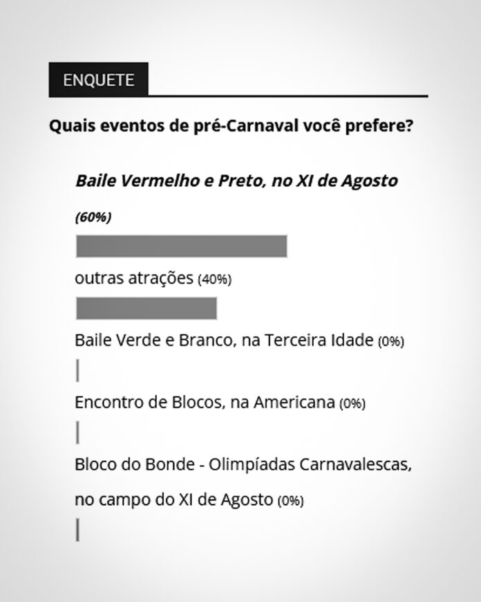 O questionamento é: “Onde você prefere festejar no Carnaval?”. As respostas disponíveis são: “blocos de rua”, “festas em clubes” e “festas em bairros”. As respostas podem ser dadas até a próxima sexta-feira, 6, às 16h.