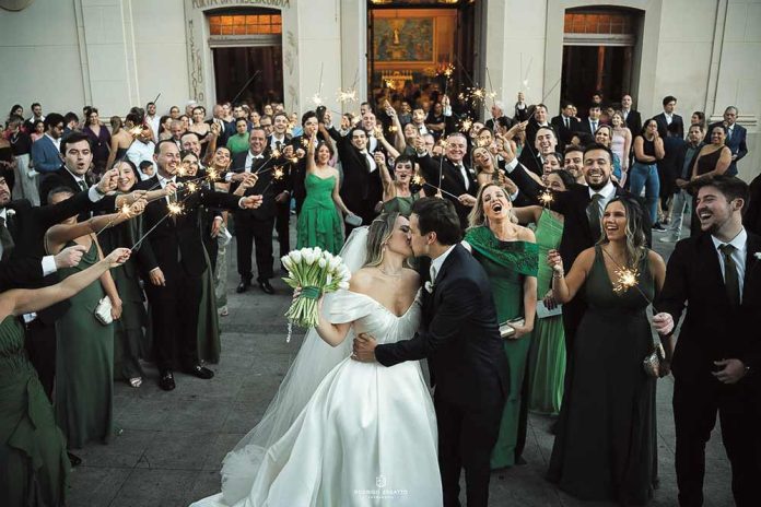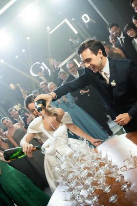Os noivos fizeram uma entrada triunfal, dançaram e jogaram champanhe em uma pirâmide de taças para brindar com os pais e padrinhos na pista.