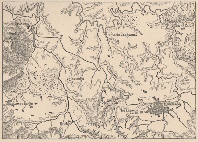 À direita e abaixo do mapa consta a então vila de Sorocaba, com o rio Supiriri à esquerda do povoado (ao lado da região denominada Los Lazaros). A localização do córrego é mencionada também em ofício do Frei Pedro Nolasco da Sagrada Família, de 2 de novembro de 1816, ao então Governo da capitania de São Paulo pedindo resolução sobre a doação de terras ao Mosteiro de São Bento. No documento, o religioso menciona que o terreno ficava próximo do antigo Rio dos Couros, chamado de Ceopirira pelos indígenas, e que se transformou em Supiriri. O ofício também revela que, além da igreja, Balthazar Fernandes, o primeiro povoador de Sorocaba, cedera terreno para as lavouras que atendiam ao convento. As terras começavam de “uma roça de mandioca até sahir ao Campo onde morava Braz Esteves (Teves), indo contestar com Diogo do Rêgo e Mendonça até sahir ao campo hoje conhecido como Itapiva (Itapeva)”. A descrição reforça a instalação da Capela del Pópulo nessa região e não na área mais próxima à Bacaetava, como se pode ver no mapa (Foto: PERRON, C. São Paulo: Sorocaba e as Minas de Ferro de Ipanema. (Mapa). Paris, 1895)
